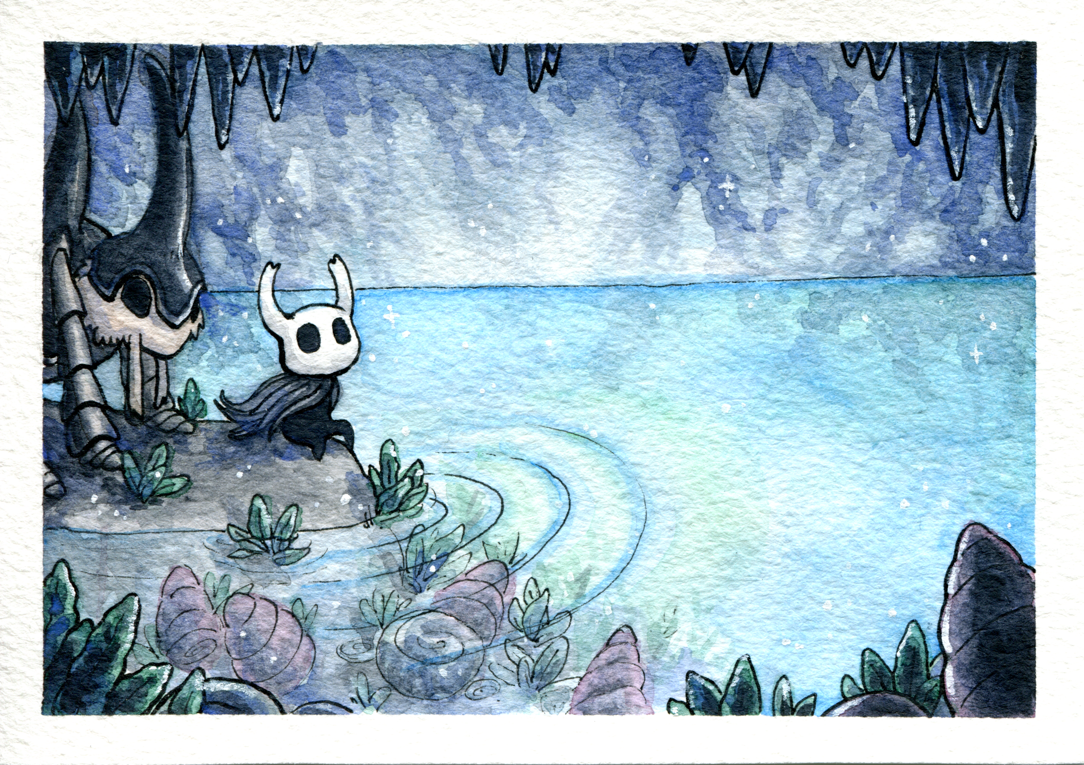 This was for an art jam, the theme being the title of the piece. For this one I wanted a mysterious atmosphere, and I liked the idea of bisecting the image with the waterline, to better capture the quietness of the water in contrast to the secrets within. I had lots of fun on this watercolour, and the dragon’s silver belly and face, as well as the gold coins, are painted with shiny paint.